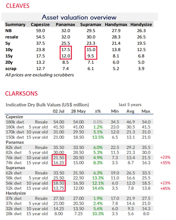 Pogledajte koliko su veće procjene u Clarksonsovoj tablici. Vrijednosti 10y/15y starih panamaxa i supri su veće za 23-45%!?! Ja u svojim izračunima koristim procjene Cleavesa, ali sada se pitam šta je tu bliže stvarnosti jer ovo nisu beznačajne razlike. Kolega jasko, jeli imaš kakve dodatne informacije o toj procjeni vrijednosti brodova - kakav im je benchmark?