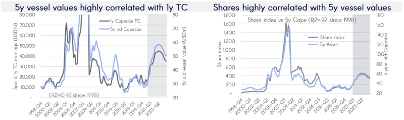 Prva tablica pokazuje jako dobru korelaciju vrijednosti 5g starih capeova i 1y TC. Joakimova projekcija ukazuje na potencijal rasta i vrijednosti brodova i visine 1y TC u sljedećih godinu i pol dana za cca 60%. Vrijednost brodova se direktno odražava na NAV firme, a toliko povećanje 1y TC vozarina znači i fine profite. Ako će TC toliko porasti sa trenutnih razina koje su već vrlo visoke, možemo samo zamisliti koliko bi morale porasti i spot vozarine.