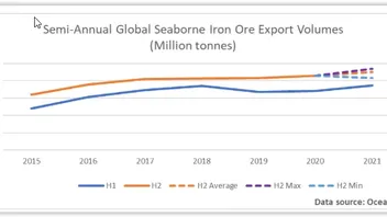 --> Prema podacima Oceanbolta, u prvih šest mjeseci ove godine, 772 milijuna tona željezne rude prevezeno je preko oceana, sto je rekord u tom razdoblju. Tijekom razdoblja 2015. do 2020. godine kolicine prevezene zeljezne rude bile su u prosjeku 10% veće tijekom druge polovice godine u odnosu na prvu polovicu. Isto se ocekuje i u narednom razdoblju.