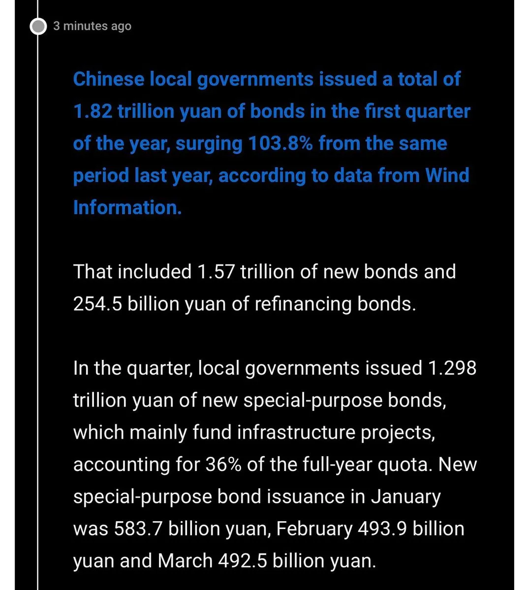 China’s local govt bond issuance accelerated in Q1. They issued 1.82 trillion yuan of bonds in the quarter, up 103.8% from a year earlier.