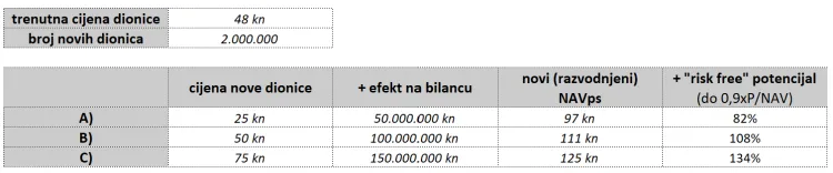 Ovo je prva varijanta koja uzima u obzir trenutnu bilancu i NAV, samo sa dodanim tim kešom od dokapa. Ako gledam recimo taj scenarij od 50 kn, i takva razvodnjena dionica ima potencijal rasta od 74% da bi došla do 0,9 NAV. To smatram po meni realno najlošijim scenarijem.
