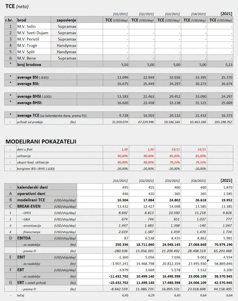 Prvo, koeficijent koji će modelirati "dane u floti". Za Q3 i Q4 sam ovo uzeo kao 14/15 (četrnaest petnaestina), time sam efektivno umanjio broj operativnih dana zbog onog jednog incidenta sa koronom na brodu (gdje je jedan brod bio mjesec dana u zastoju), i u drugom kvartalu ista stvar zbog nekog sličnog incidenta, ne sjećam se sada više napamet o čemu se radilo.