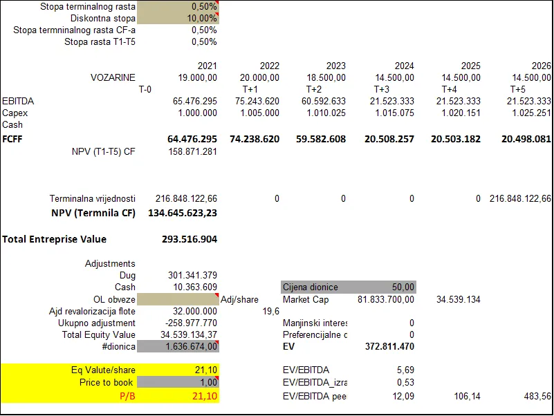 • druga velika greška u analizi ti je što ne uzimaš u obzir promjenu vrijednosti brodova, ti im samo umanjuješ vrijednost za amortizaciju i kasnije računaš terminalnu vrijednost - a znamo da su brodovi prihodovna imovina i da kada su vozarine visoke brodovima strašno raste vrijednost pa time podiže vrijednost firme - to ti se ovdje u DCF nigdje ne vidi, a evo ti ove godine primjer vrijednost brodova je narasla 50-100% - koliko je samo zbog toga porasla vrijednost firme?