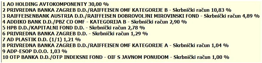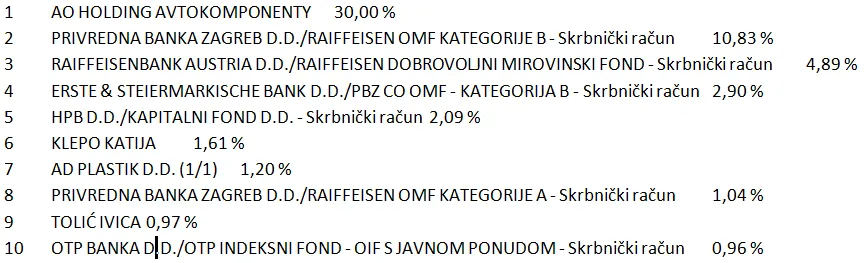 Pa, svi ovi mirovinski fondovi valjda vrijede više od nečijeg skrbničkog računa za koji se ne zna ni čiji je. A možda je prodao tek da nije u prvih 10. Ti na dnu su napravili samo neku zamjenu, neki su ušli neki izašli. Sveukupno dok se zbroji na gornjem Top 10 je 57%, a na donjem 56,5%.