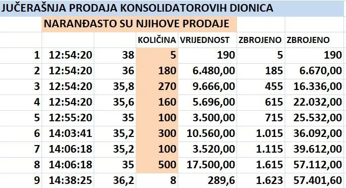 Ovo sa rješenjem je jasno da je Dalekovodu po prvoj presudi trebalo biti vraćeno što mu je ovrhom oduzeto ali po drugoj presudi je ta odluka poništena tako da Dalekovod nije ni u minusu ni u plusu jedino mora platiti sudske troškove parnice. Ja bi ovom objavom o sporoj prodaji Konsolidatorovih dionica kojih ima još otprilike pola serije "A". On podigne malo cijenu pa kad se pojavi neka malo bitnija količina na kupovnoj strani proda u nizu i posljednja je prodaja uglavnom sve jeftinija i pomalo spušta cijenu. Problem je u tome što se on stalno postavlja na prvo mjesto na prodajnoj strani s najnižom cijenom, a jasno je da osim njega još malo tko prodaje. Prijašnjih dana se pokazalo kada ti malo više podignu cijenu na prodajnoj strani dozvoljavaju i Konsolidatoru da ostane prvi ali da i on podigne cijenu i pojavila se vrlo dobra ponuda na kupovnoj strani ono što Konsolidator i čeka. Problem je što ti koji su sljedeći poslije Konsolidatorove ponude spuštaju cijenu na nekih 40 kn, a svejedno neće pored Konolidatora prodati dionice. Po mome bi trebali podignuti cijenu na 50 ili više kuna da dozvole Konsolidatoru da i on podigne na blizu 50 ili više. Prošlih dana se pokazalo kako to dobro funkcionira i krene ponuda na kupovnoj strani. Da je danas ponovno nastavljeno loše, kao prije posljednjih, za prodaju vrlo dobrih, nekoliko dana.