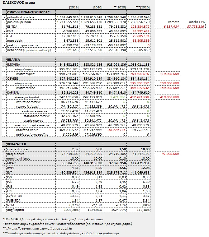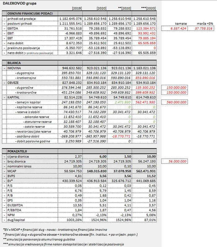 Prihode sam ostavio iste, dobit sam povećao za iznos kamate koji su plaćali u 2020., povećao sam maržu za 3pp tako da im NPM bude oko 5%, nema onog nesretnog gubitka iz prekinutog poslovanja koji je dosta iskrivio sliku za 2020. Za potrebe izračuna pokazatelja sam pretpostavio da je cijena dionice 10 kn.