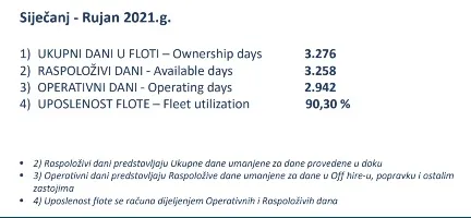 2.Zasto je pao postotak uposlenosti flote na cca 90% ako smo u uvijetima ogromne potraznje za brodovima? Koliko se sjecam iz prethodnih izvjestaja uobicajeno se kretao oko 95%. Uzrokuje li ovo smanjenje uposlenosti i smanjeni ebitda u prvom pitanju?