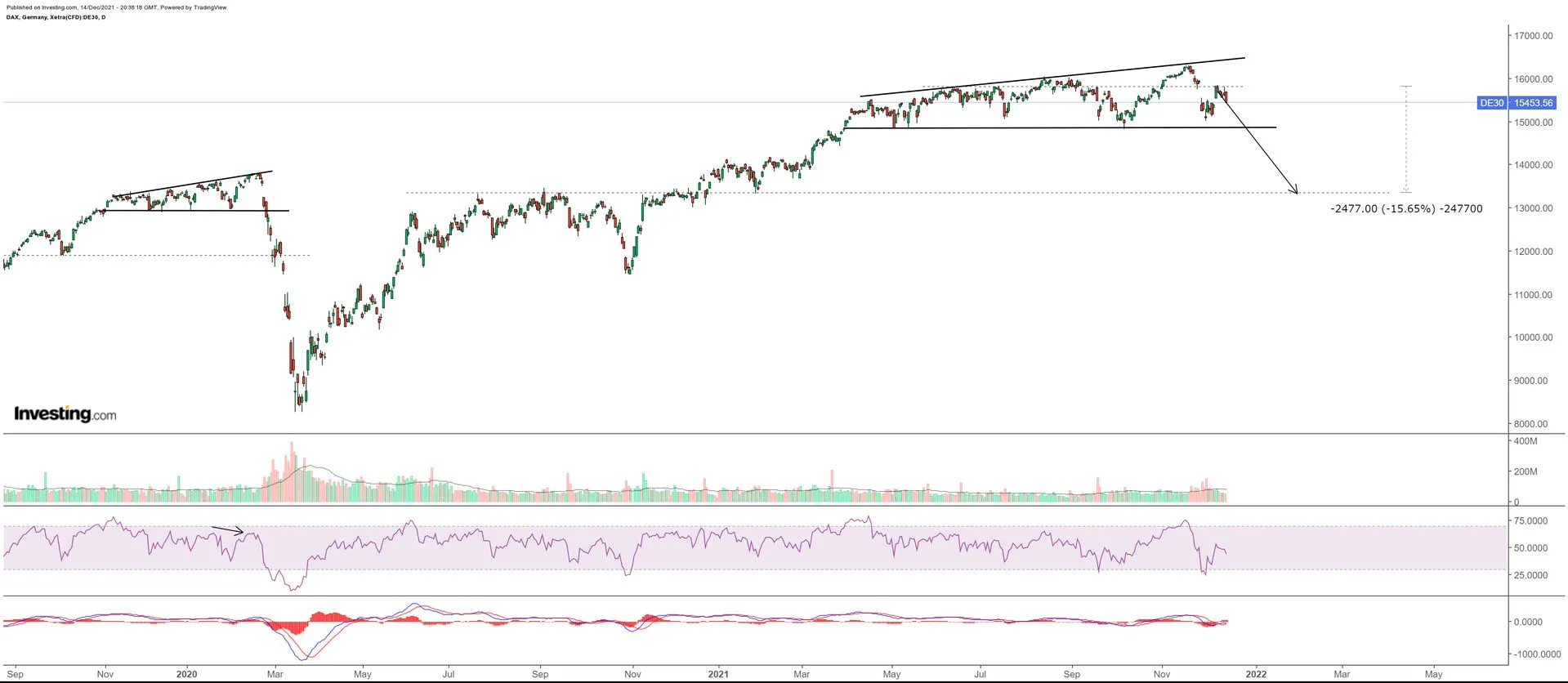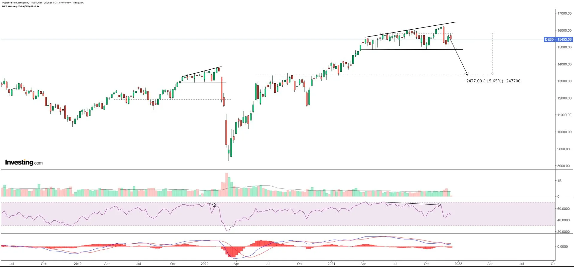 DAX slika zanimljivu sliku, vidimo tehnički veliku sličnost sa početkom 2020. Right-angled broadening wedge i bearish divergenciju na RSI.
