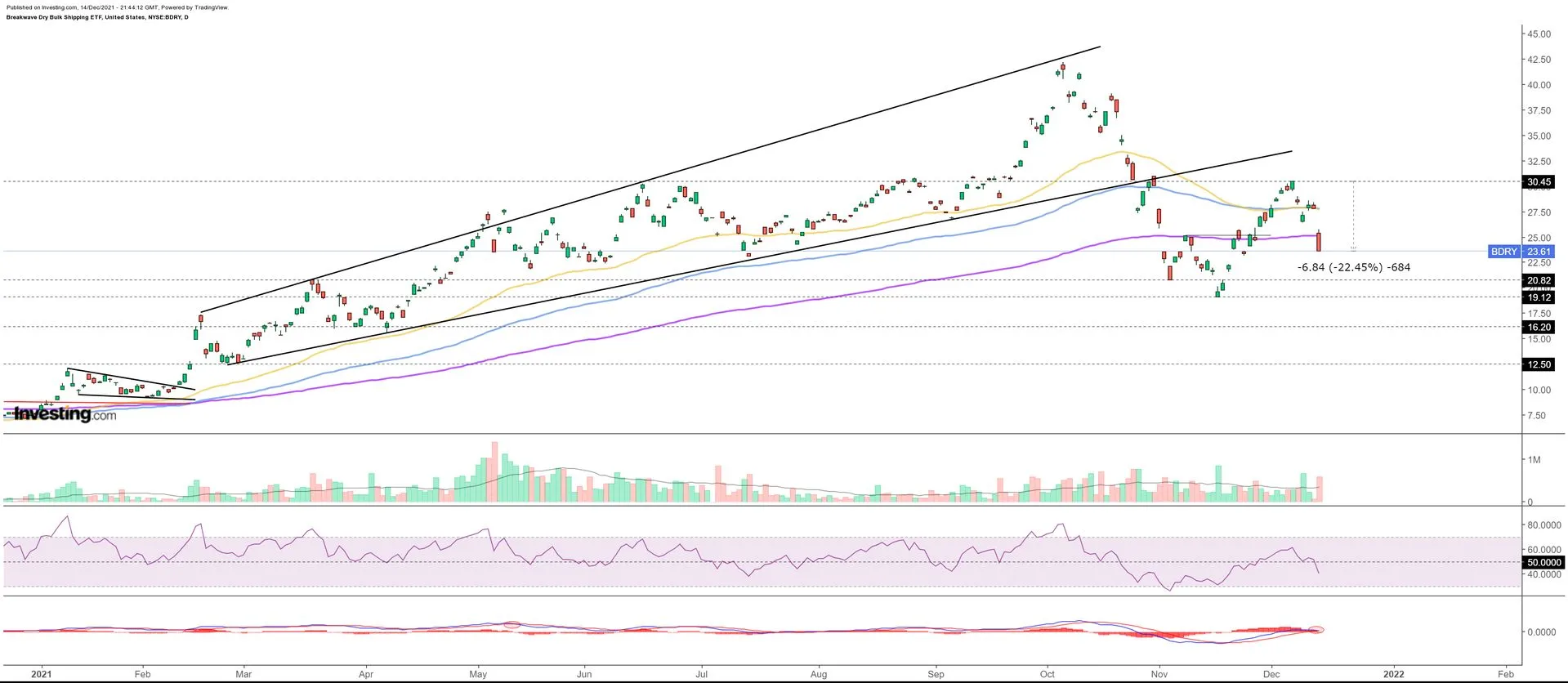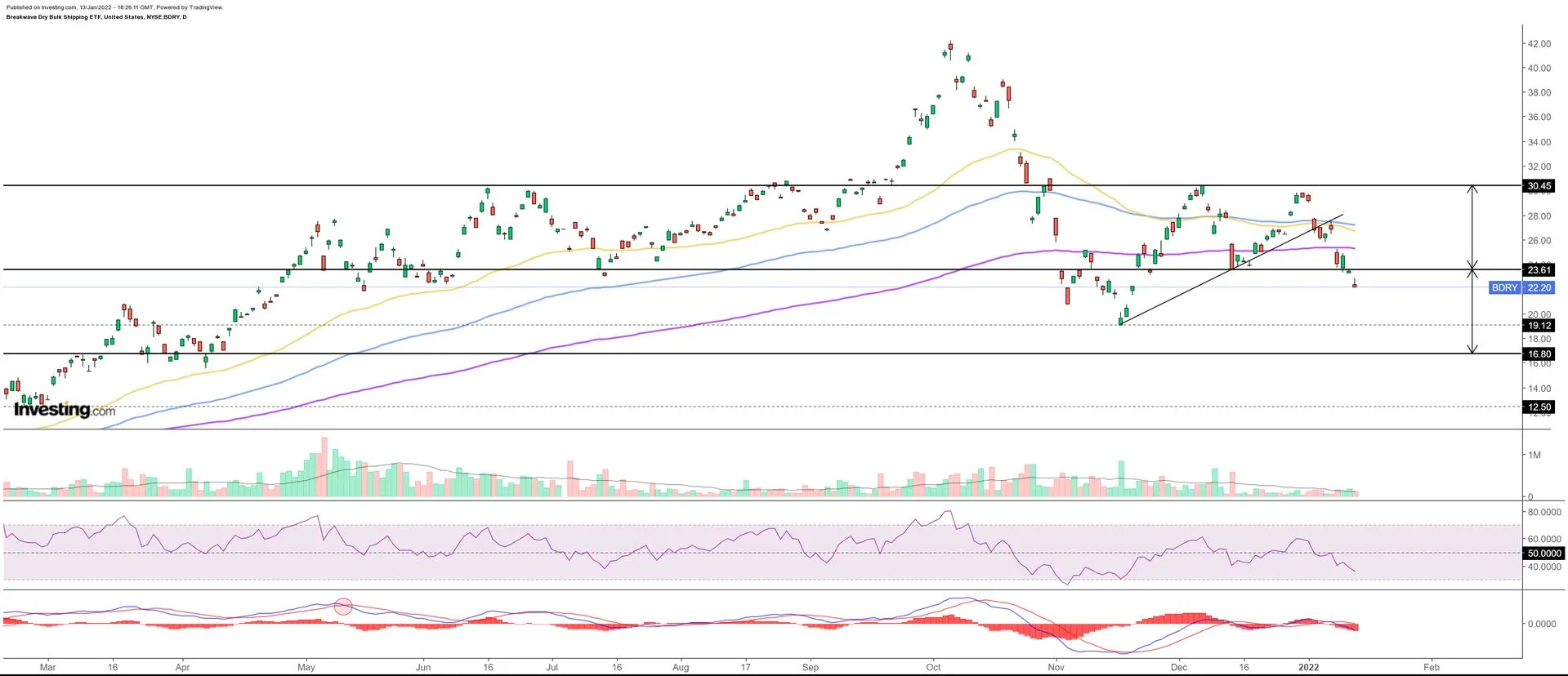 BDRY se ponaša dosta predvidljivo, rekli bi "školski". Vidjeli smo propad ispod double top "neckline-a", retest i onda opet danas značajan pad koji trenutno iznosi -9,77%. Današnji pad je na značajnom volumenu, 2,5 puta većem od prosjeka, a dan još nije zaključen. Do targeta ima još cca 20%.