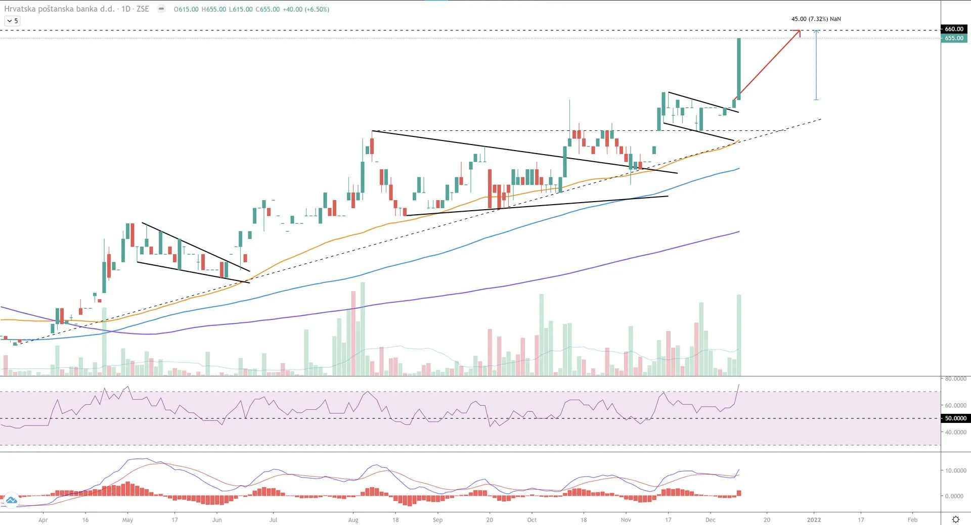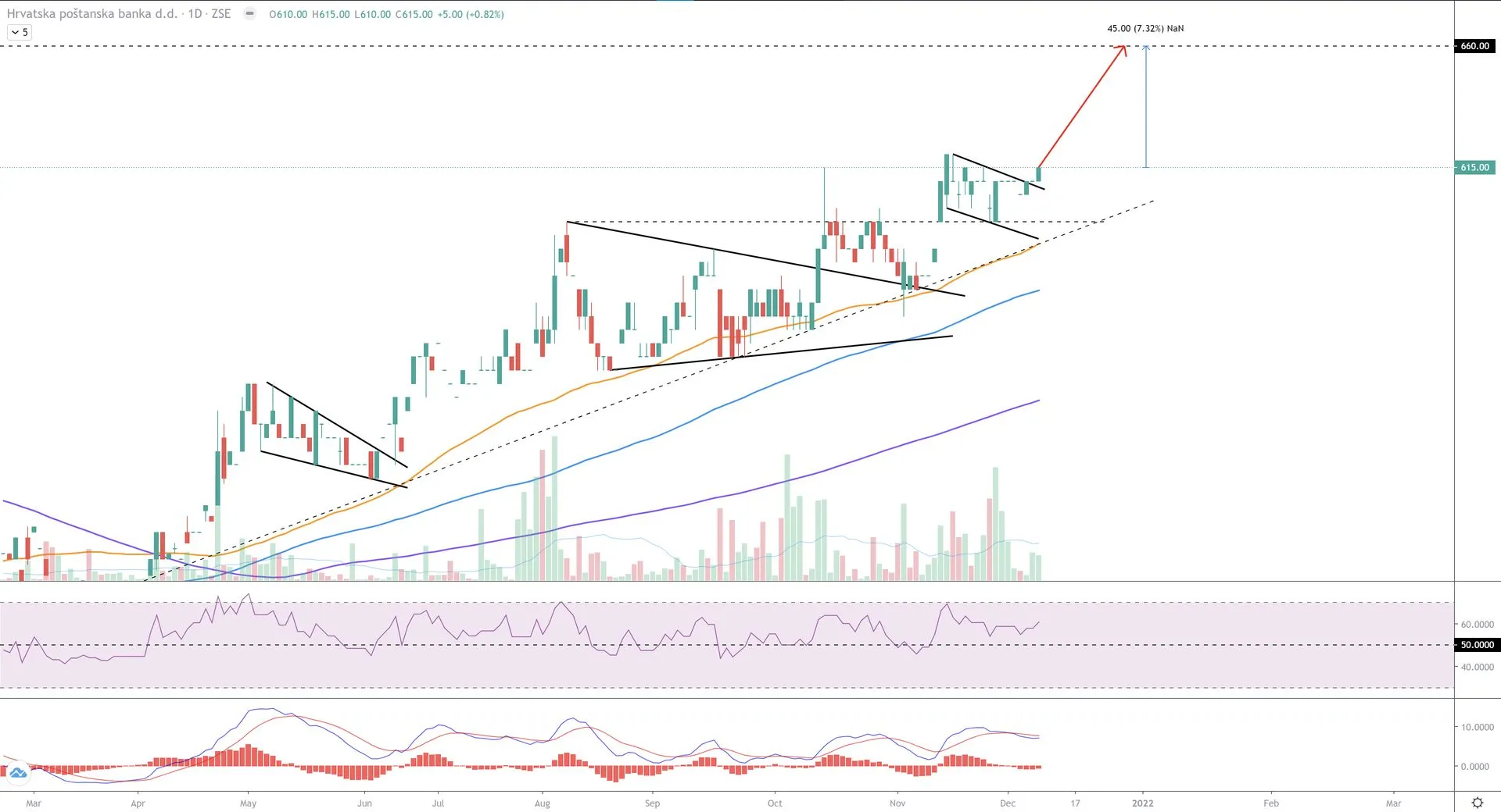 Na daily grafuse bolje vidi wedge, a divergencija je na weekly grafu. Pattern je naravno valjan samo u slučaju ako indeks probije donju liniju, to vjerujem da više ne moram posebno napominjati - do tada pratimo razvoj događaja.