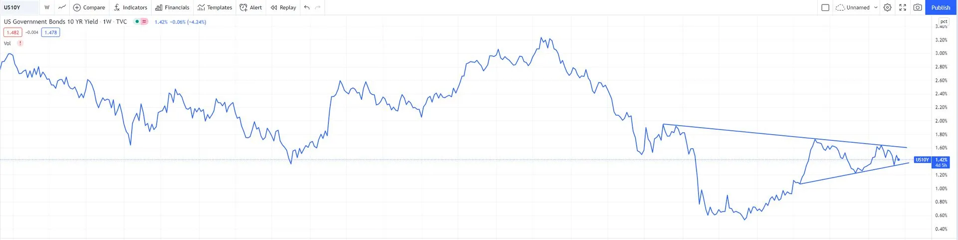 Moguci H&S i uz to taman jedan wedge prakticki dva paterna na tjednom grafu, uz to i konstantno testiranje prijasnjeg otpora, kad je tako moglo bi imat vecu tezinu prema smjeru u kojem izabere, kako izgleda po slici izgleda da ce se vrlo brzo odrediti smijer u narednom periodu