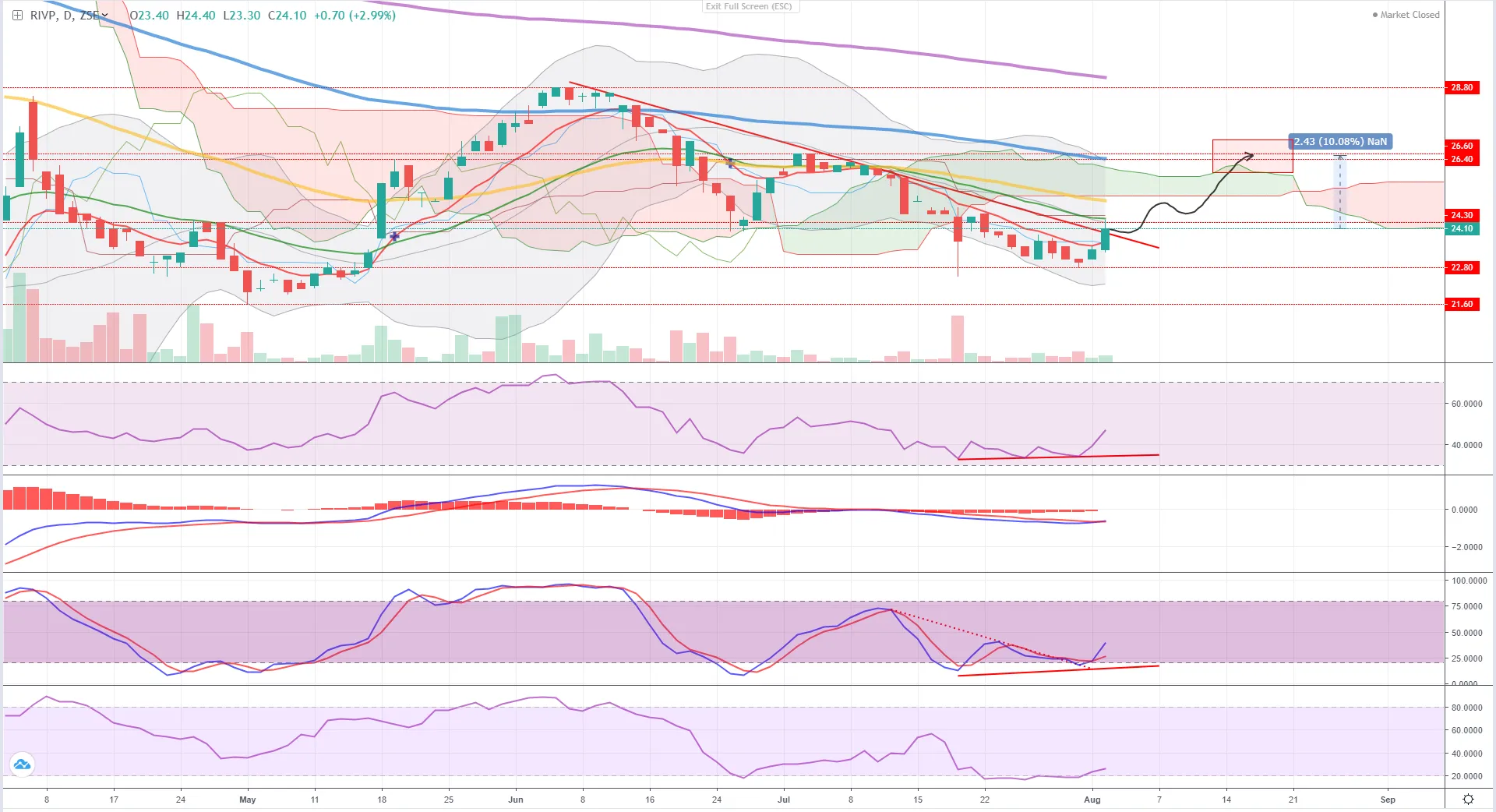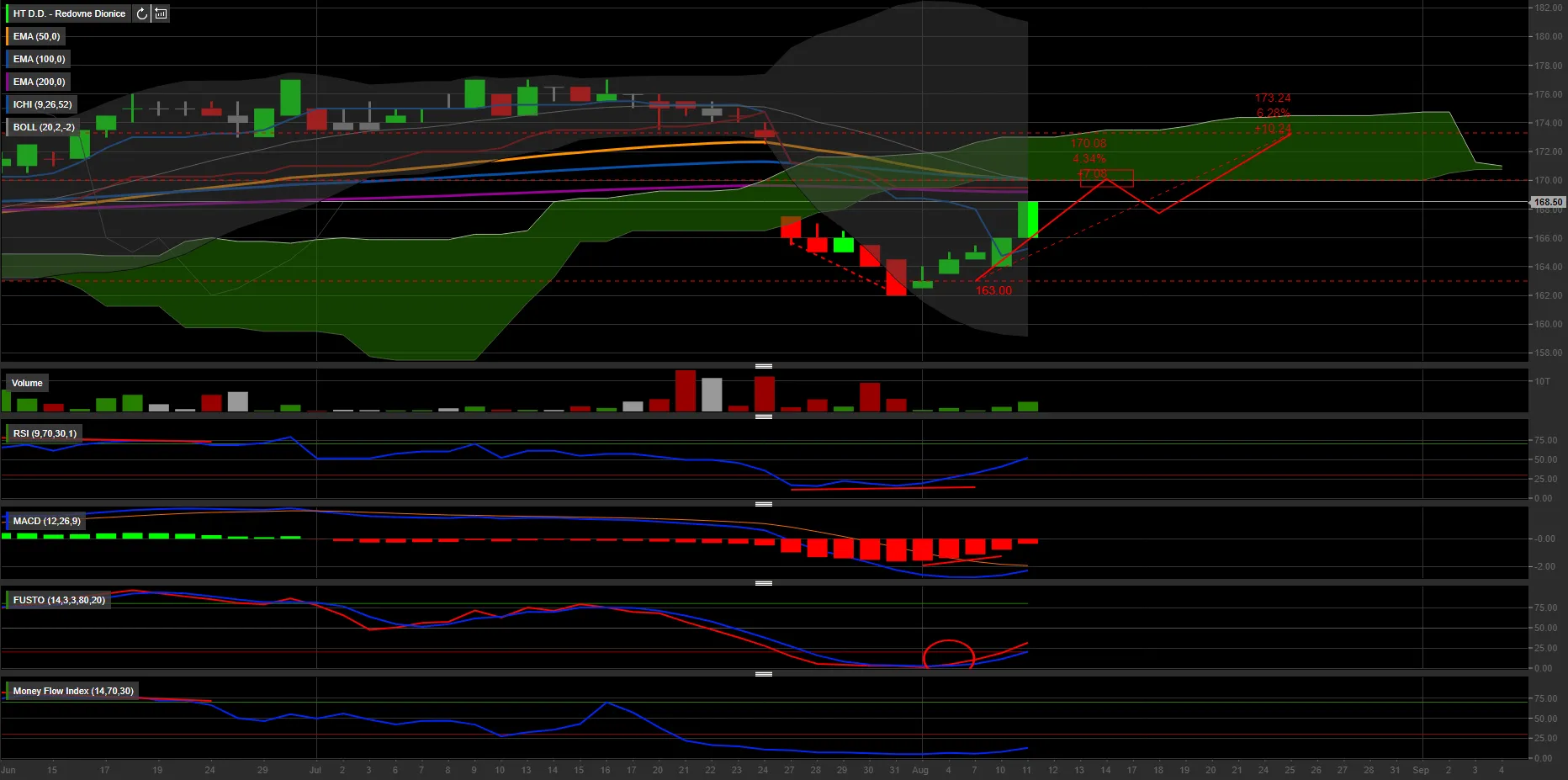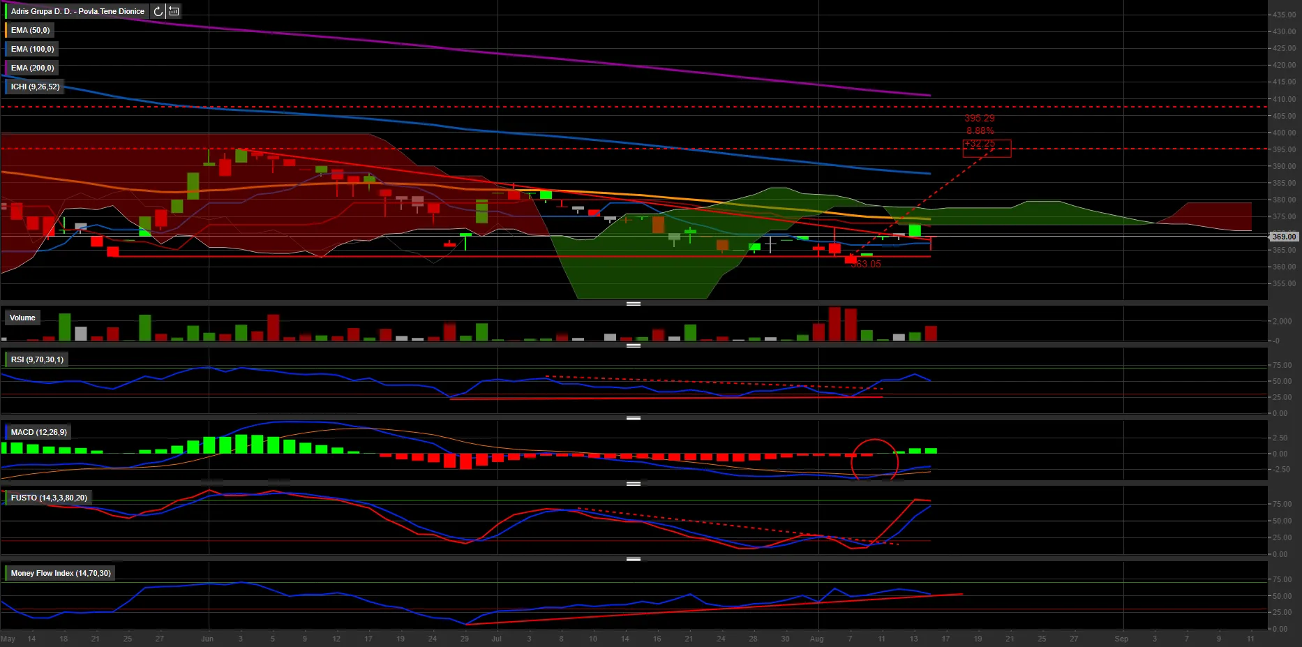 RSI je danas probio liniju trenda, MACD je danas dao buy signal, Stochastic probija liniju trenda i izlazi iz oversold, MFI je u dugom uptrendu.