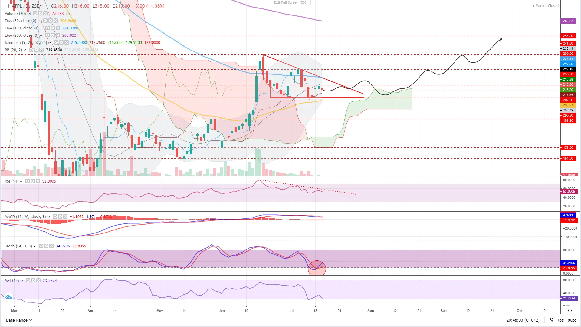 ADRS2 i dalje izgleda dobro. Jučer smo imali pullback odnosno retest trokuta. Cijena je pala na povećanom volumenu i zatvorila točno iznad vrha trokuta. Uz to se formirala dragonfly doji svijeća koja obično označava dno. Sada je ključno vidjeti u kojem smjeru ćemo u ponedjeljak. Poželjno bi bilo da dobijemo nekakvu zelenu svijeću koja bi potvrdila preokret.