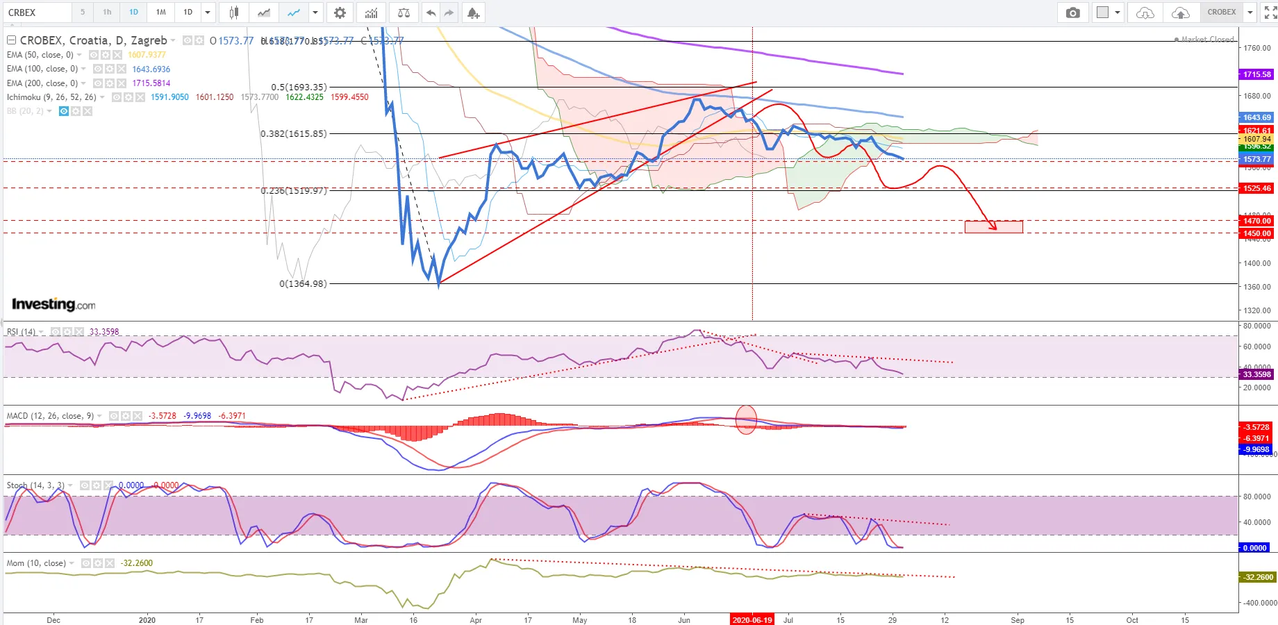 Graf crta descending triangle. To je inače bearish pattern, ali se mora gledati u kontekstu jer može biti i continuation pattern. Ako ga gledamo kao bearish pattern, target bi bio oko 176 kn, ali meni se čini da će biti continuation sa targetom oko 255 kn.
