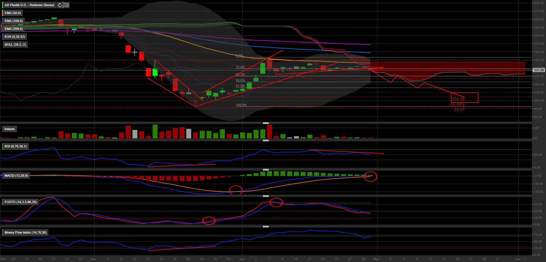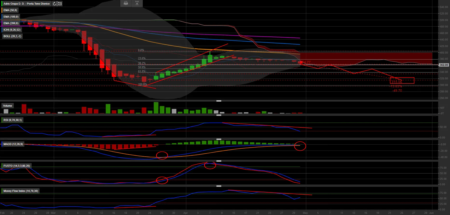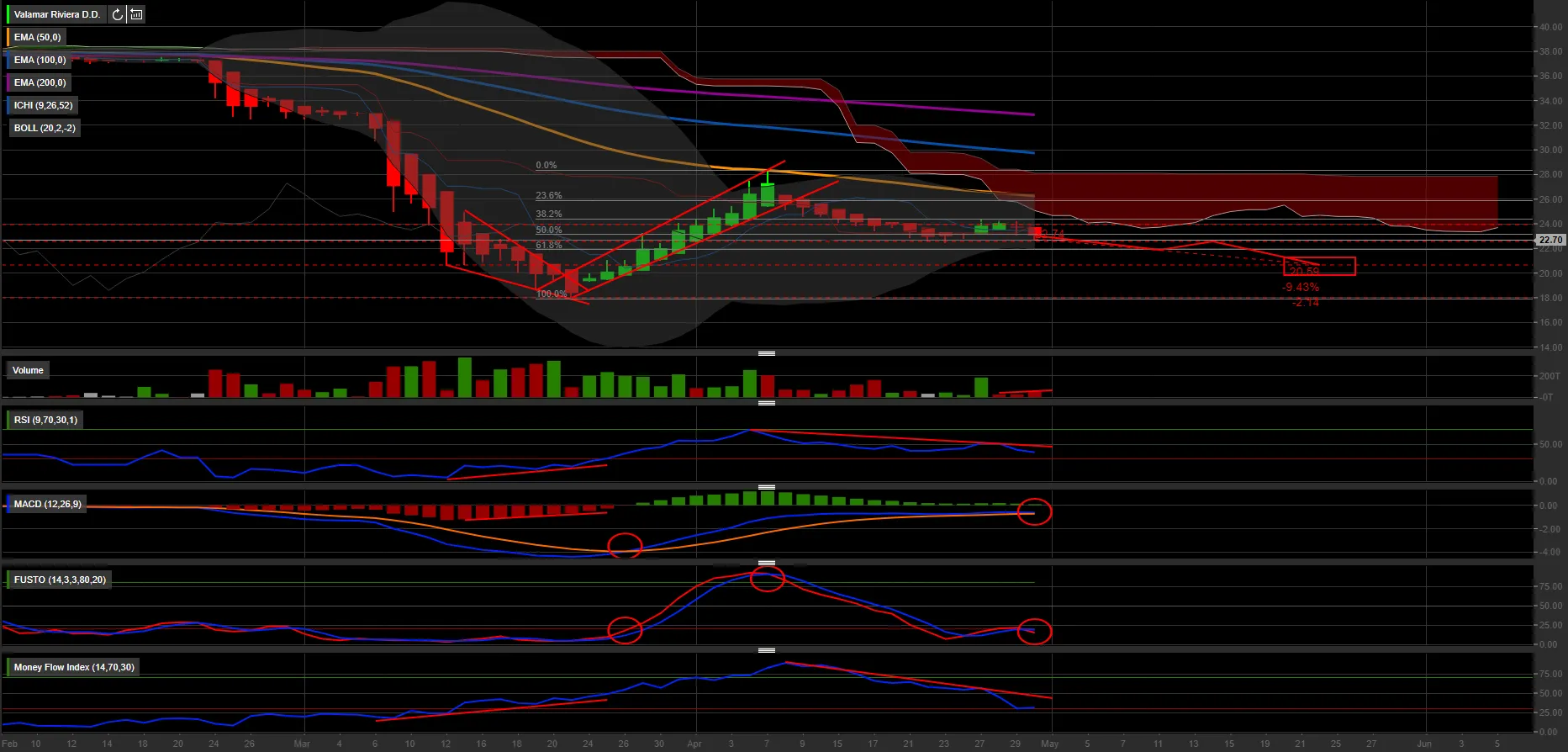 MACD je već prešao signal line, Stochastic i MFI su već dobro u oversold. Na cca 1.100 kn imamo dobru razinu podrške, i sada unazad mjesec dana, ali i unazad zadnje četiri godine.
