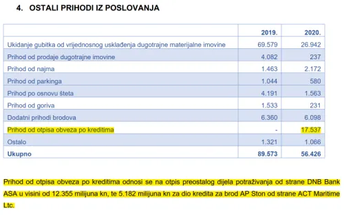 Bareboat charter za Sv. Vlaho i Držić se vode pod zajmovima. Ugovor za bareboat je obnovljen u 06/2020 na rok od 3 godine (sa mogučnošću produljenja za jos 2 g). Na kraju 2020. imaju glavnicu zajma još 18,5m USD, što je godišnje po brodu (18,5m / 2,5 g / 2broda) 3,7m USD godišnje, a što znači da najam po danu iznosi (3,7m/365) 10.136 USD.