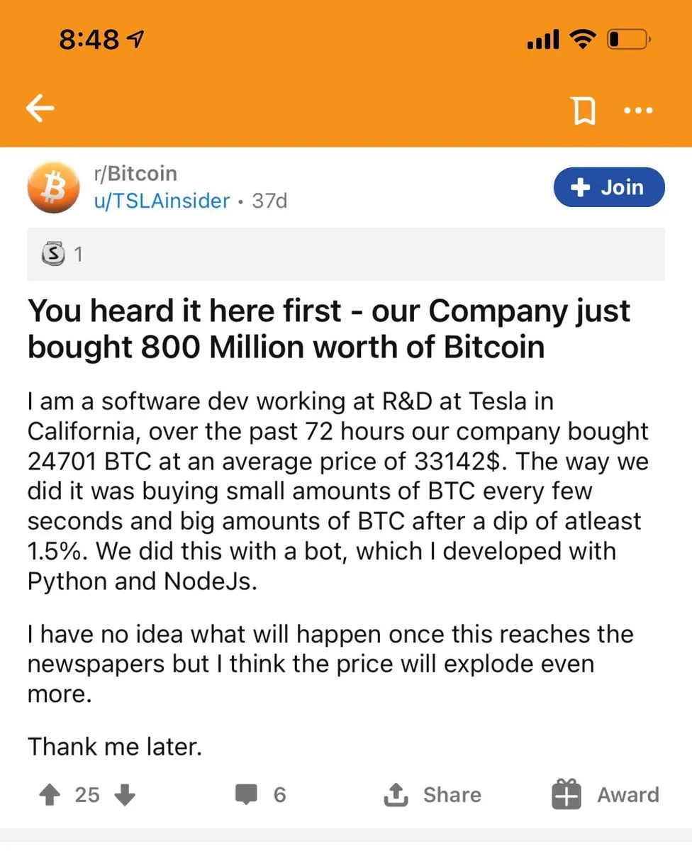 Mislim da nije to stvar. Onima koji ne prate i ne razumiju Bitcoin je to tesko shvatljivo. Za Muska se smatra da je vizionar, predvodnik... mora njegovati taj imidz. Bitcoin is here to stay. On je prvi iz sastavnice S&P500 koji dio likvidnosti drzi u Bitcoinu (navodno je ulozio oko 7% cash pozicije Tesle). Pitanje je vremena kada ce i ostali krenuti tim putem. A vjerujem i da ce ovim ulaganjem ostvariti odlican povrat. Evo vec neki analiticari dizu preporuke za Teslu.