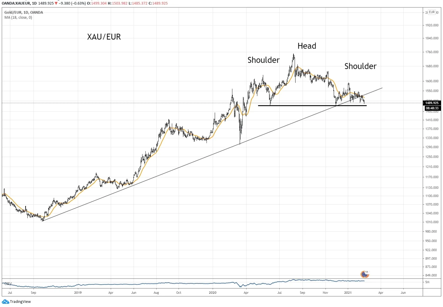 Trenutno je nekoliko problematičnih "caka". Ako se cijena ubrzo ne odlijepi od dna ove "trube", bojim se da ćemo vidjeti niže cijene. Konsolidacija na zoni podrške (ili ispod zone otpora) obično znači da će ubrzo ta zona popustiti. RSI je pao ispod trendlajna i testira ga. 10 i 20 EMA su napravile bearish cross. Ako pogledamo zadnji pad cijene unutar trube i sada ovu konsolidaciju, možemo vidjeti da se cijena konsolidira u formi bear flaga, čiji je target jednak targetu "trube".