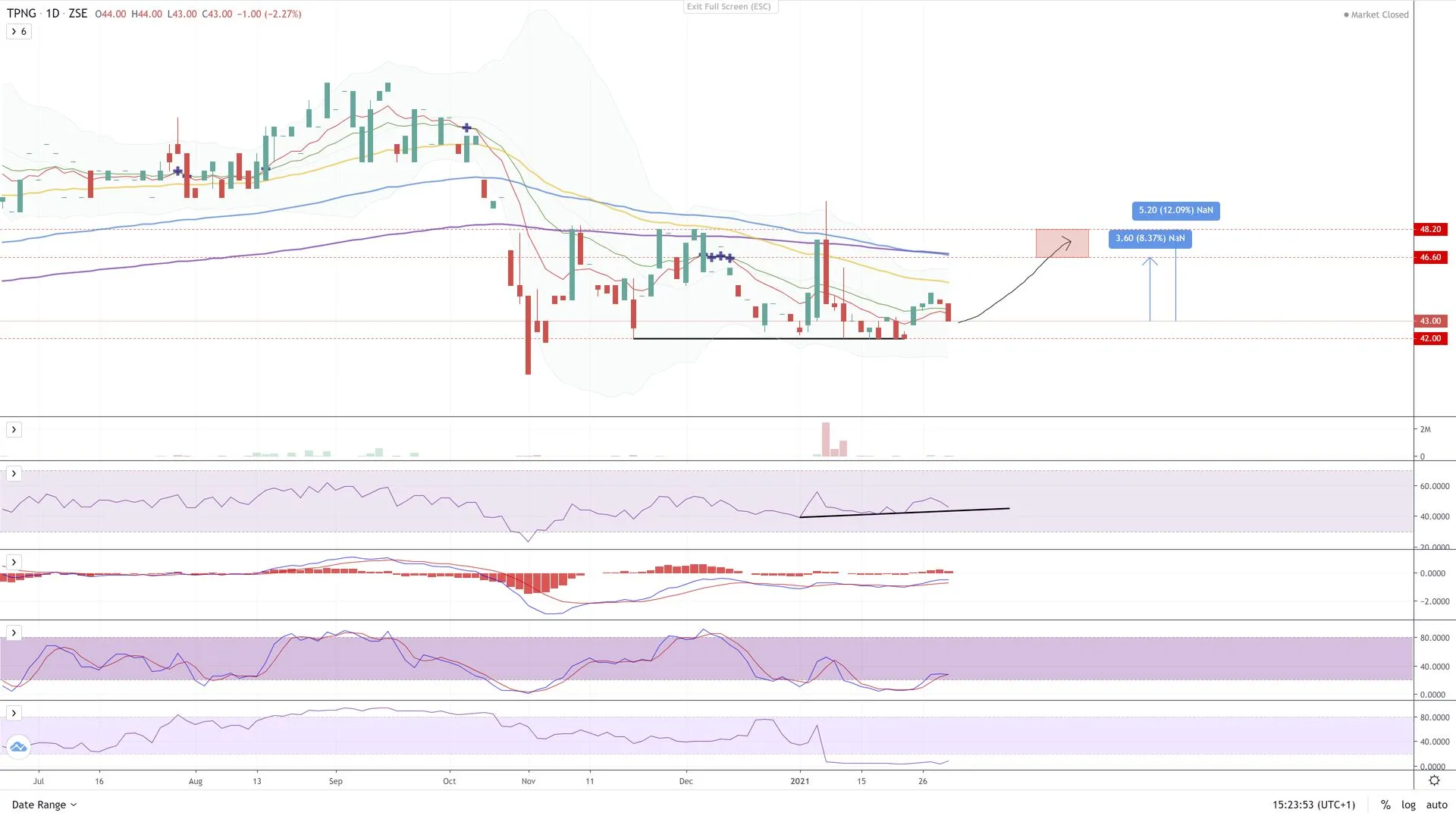 Vjerujem da ćemo kratkoročno vjerojatno opet vidjeti cijenu oko 46,60-48,20 kn, tako da ako netko misli prodavati, preporučam da se još malo strpi, mogao bi ubrzo svoje dionice utopiti za 8-12% skuplje. Cijena je trenutno blizu zone podrške (42 kn), RSI je nedavno ukazao na bullish divergenciju (koja se ipak moguće već materijalizirala ovim rastom u zadnjih par dana, ali mislim da vrijedi probati), MACD se konsolidira, a Stoch taman izašao iz overbought.