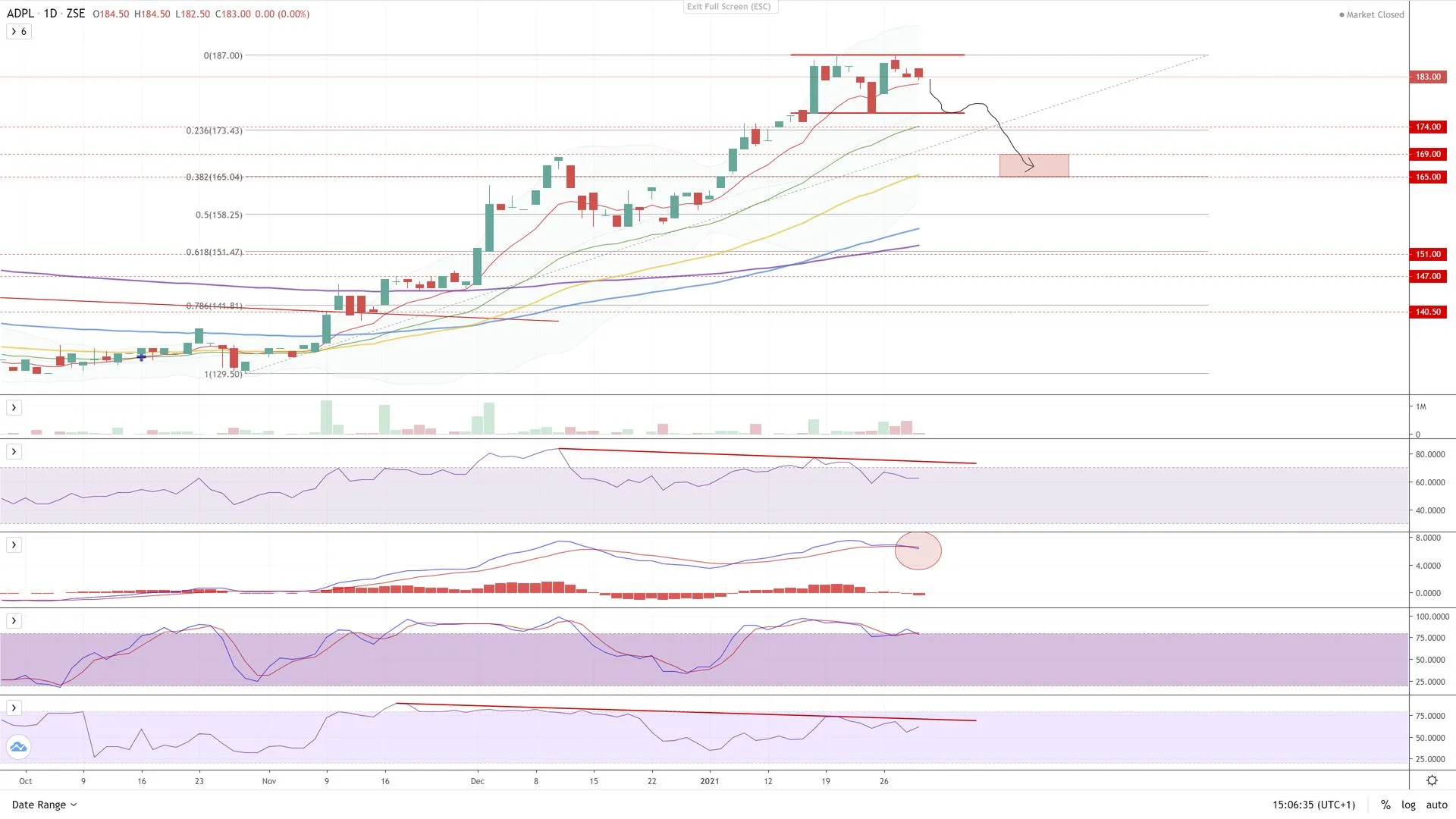 Cijena je i dalje u uptrendu, trenutno u fazi konsolidacije, izgleda da se formira bull flag. Hoće li flag biti u formi trokuta (crtkana linija) i klasične zastavice, pitanje je svih pitanja. Meni se za sada čini da ćemo prvo vidjeti propad do cca 160 kn prije nego vidimo breakout. O trenutku breakouta naravno ovisi i visina targeta, ali ajmo načelno reći da je prvi target i dalje 192 kn, drugi 214 kn. Treba pratiti. RSI će vjerojatno prvi dati signal daljnjeg kretanja cijene.