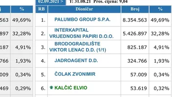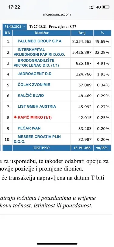 Slažem se. Stanje koje je dostupno na određeni datum u SKDD bazi je od 2 radna dana ranije, tj. transakcije napravljene na datum T su vidljive tek 2. radni dan nakon datuma transakcije. Ako pogledamo stanje za 01.09. što je u stvari stanje od 30.08. vidimo da gospodin Rapić više i nije u top 10. Sigurno mu je ostalo manje od 32000 dionic, a po trgovini u zadnja dva dana (31.08. i 01.09.) najvjerojatnije mu nije ostalo ništa.